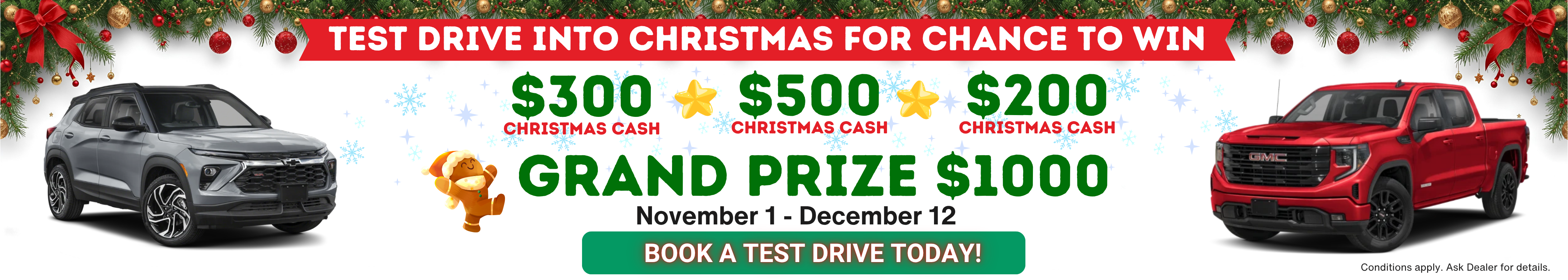 * Instant tire manufacturer rebates are available when you purchase four (4) identical eligible tires at participating Chevrolet, Buick, GMC and Cadillac dealers in Canada. Instant rebates available: $120 on Bridgestone winter tires, $90 on Firestone winter tires, $80 on Continental winter tires (including SecureContact AW), $70 on Michelin tires, $70 on Pirelli tires, $60 on Hankook winter tires, $50 on BFGoodrich tires, and $40 on General winter tires (including AltiMAX 365 AW). Offer is valid from September 1, 2025 to December 31, 2025. This offer is non-transferable and may not be combined with other offers. Installation and balancing are extra. Limit of 1 instant tire manufacturer rebate per VIN. Conditions and limitations apply. Offer may not apply to tires on all GM models; see participating dealers for details. No rain checks available. This offer may be changed, cancelled or extended at any time without notice. 1 TIRE 30-DAY PRICE MATCH GUARANTEE: Your local dealer will match the competition's prices. If you purchase one of the aftermarket tire brands listed below and later find a competitive price on a qualifying brand within 30 days of the purchase, we’ll refund the difference. Tire Brands: BFGOODRICH, BRIDGESTONE®, CONTINENTAL, FIRESTONE®, GENERAL, GOODYEAR®, HANKOOK, KELLY, MICHELIN, PIRELLI, UNIROYAL, KUMHO. The price match applies to the brands listed above. Competitive Prices: The competitive price you find must be in a valid ad, written estimate or Internet quote for identical, new tires. The tires must be an exact match in brand, tire line, size, load rating and speed rating to be eligible for the price match guarantee. All competitive quotes (including internet quotes) must come from a local competing tire retailer and installer (with a physical location within 100km of your participating GM retailer). The competitive price must be valid within 30 days of your purchase of any of the tire brands listed above. Service and Installation: The price match guarantee is only valid on the tire price and does not include installation/labour. Offer available to retail customers only at participating Canadian Chevrolet, Buick, GMC and Cadillac dealers. Offer valid from January 1, 2025 to December 31, 2025. GM Canada reserves the right to cancel, modify or amend the offer without notice. Conditions and limitations apply. May not be combined with other offers and programs.