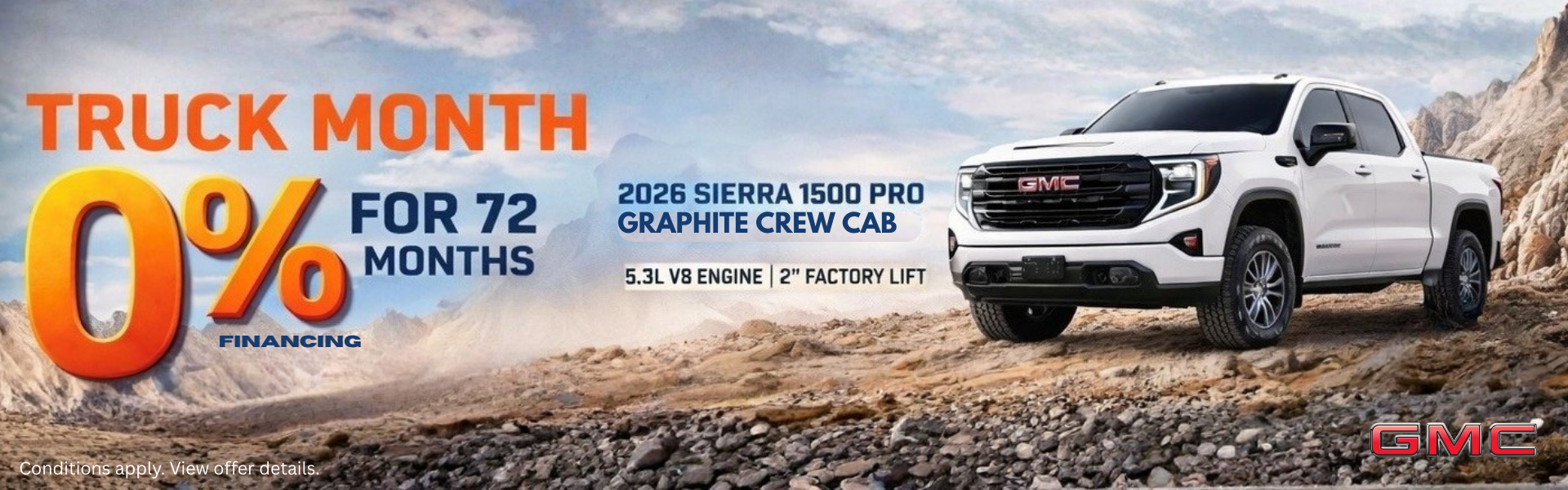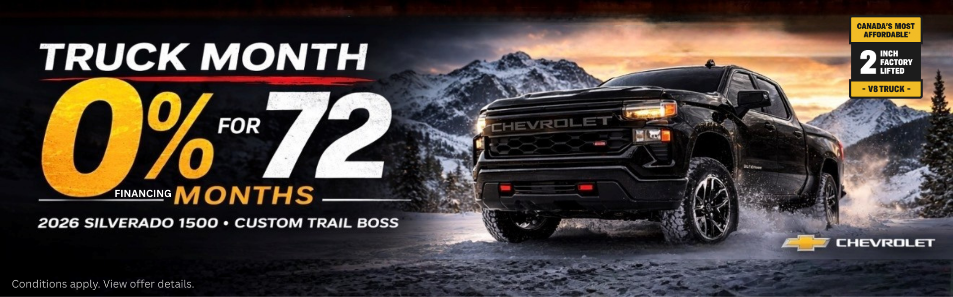 *Offer applies to the following eligible tire brands: BFGOODRICH, BRIDGESTONE®, CONTINENTAL, FIRESTONE®, GENERAL, GOODYEAR®, HANKOOK, KELLY, MICHELIN, PIRELLI, UNIROYAL, KUMHO, COOPER. Must purchase four (4) identical tires. Dealers are free to set individual prices. Offer does not include balance or installation of tires. Offer may not be combined with certain other consumer incentives. Offer available to retail customers only. At participating dealers only. Offer available between January 1 to March 31, 2026. In-stock tires only; Quantities may be limited. See dealer for details. 1 TIRE 30-DAY PRICE MATCH GUARANTEE: Your local dealer will match the competition's prices. If you purchase one of the aftermarket tire brands listed below and later find a competitive price on a qualifying brand within 30 days of the purchase, we’ll refund the difference. Tire Brands: BFGOODRICH, BRIDGESTONE®, CONTINENTAL, FIRESTONE®, GENERAL, GOODYEAR®, HANKOOK, KELLY, MICHELIN, PIRELLI, UNIROYAL, KUMHO, COOPER. The price match applies to the brands listed above. Competitive Prices: The competitive price you find must be in a valid ad, written estimate or Internet quote for identical, new tires. The tires must be an exact match in brand, tire line, size, load rating and speed rating to be eligible for the price match guarantee. All competitive quotes (including internet quotes) must come from a local competing tire retailer and installer (with a physical location within 100km of your participating GM retailer). The competitive price must be valid within 30 days of your purchase of any of the tire brands listed above. Service and Installation: The price match guarantee is only valid on the tire price and does not include installation/labour. Offer available to retail customers only at participating Canadian Chevrolet, Buick, GMC and Cadillac dealers. Offer valid from January 1, 2026 to December 31, 2026. GM Canada reserves the right to cancel, modify or amend the offer without notice. Conditions and limitations apply. May not be combined with other offers and programs.